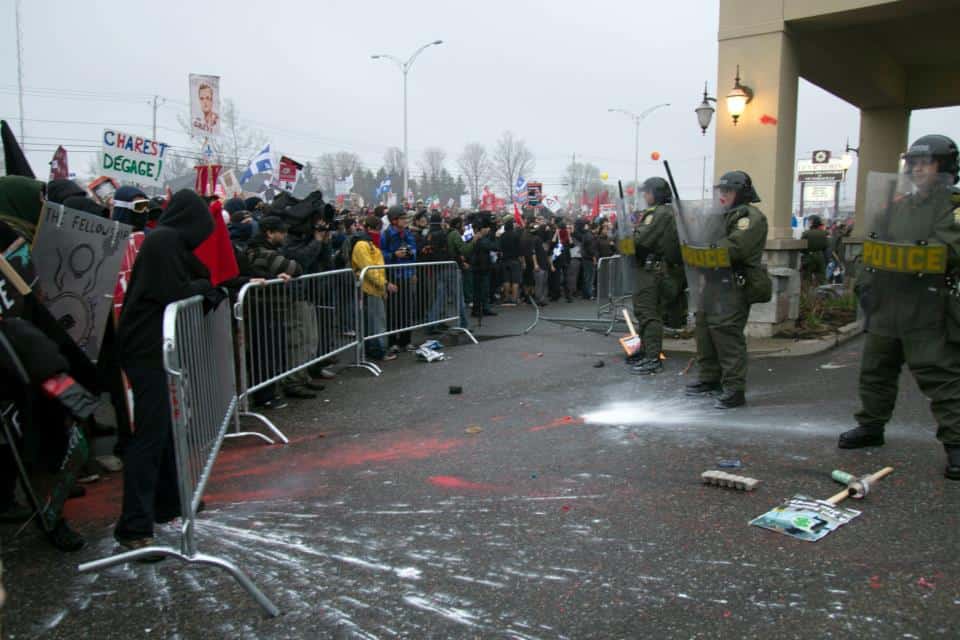 Protestors gathered in Victoriaville late Friday afternoon where Quebec Premier Jean Charest was set to address the council at 7:20 p.m. The provincial police force, Sûreté du Québec (SQ), had secured the perimeter of the hotel by the time busloads of protesters started to arrive at around 4 p.m.
